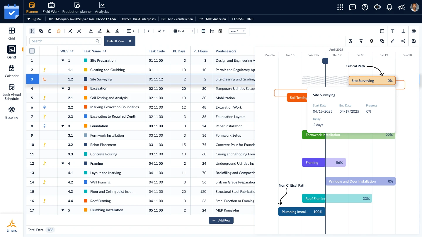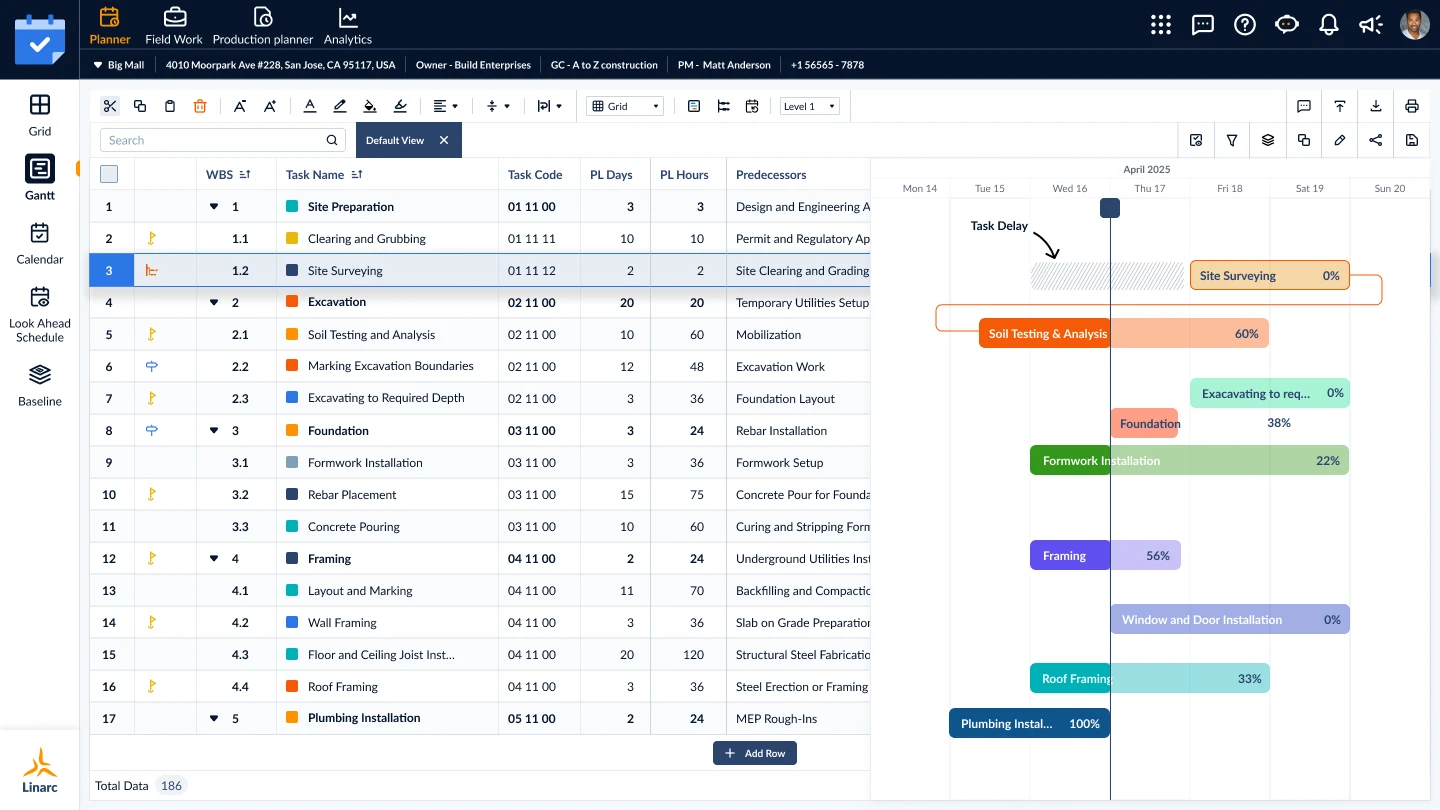 Platforms like Linarc empower GCs to reschedule dynamically—not just adjust dates, but auto-update every dependent task. Here’s how:- Weather Delays: Built-in slack buffers let you plan for rainy days. When a storm hits, log the delay, and Linarc shifts pour dates and all downstream tasks (e.g., electrical, framing).