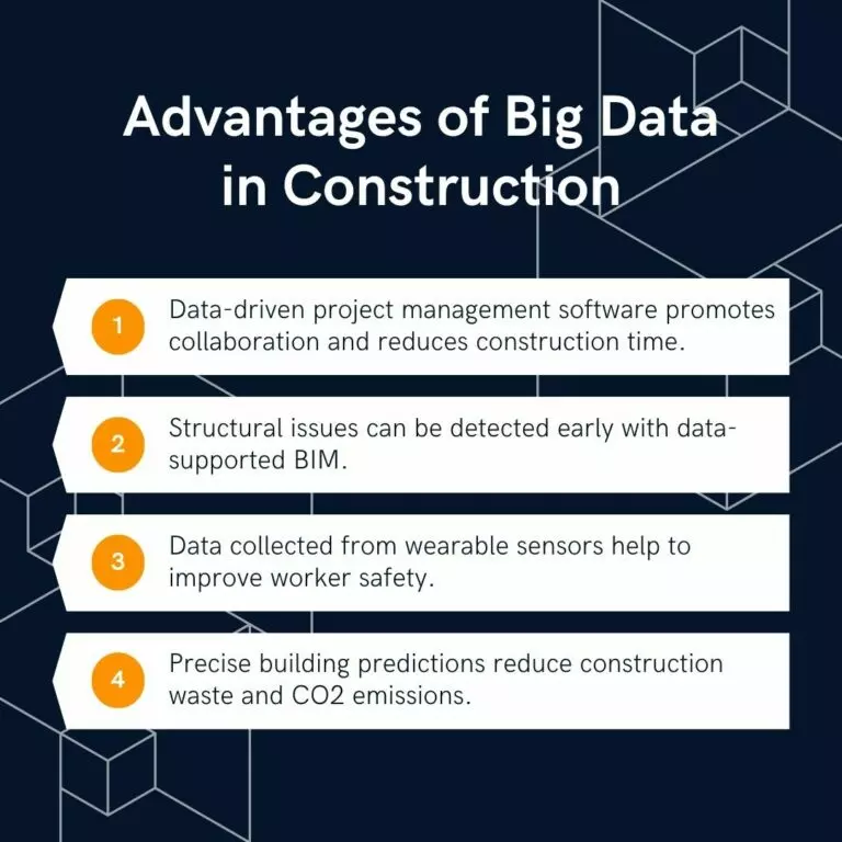 - Building Construction- Big data ensures the smooth execution of construction processes, facilitating collaboration and coordination among team members. Using sensors can alert the project team if activities deviate from the planned path.