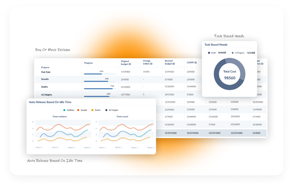 Balance field crews successfully on all active job sites. Improve crew productivity with weighted allocation. Let tasks' due dates, site readiness, and project status guide daily crew assignments.