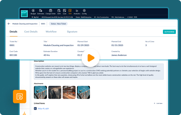 - Generate T&M tickets directly from the field with cost estimates for labor, materials, and equipment. Set change order and cost limits for materials and trades.