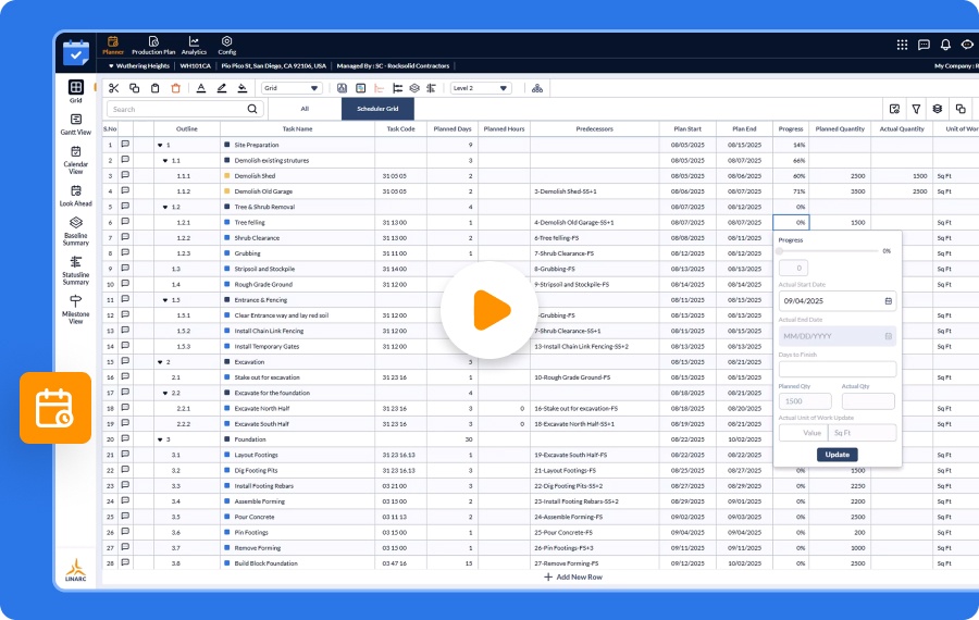 - Easy Updates Anywhere: Record completed quantities directly from the web console or Linarc mobile app.