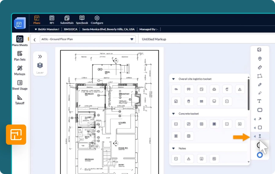 Easily mark precise locations on plan sheets using graphical pins to visually represent tasks, installations, or site-specific features.