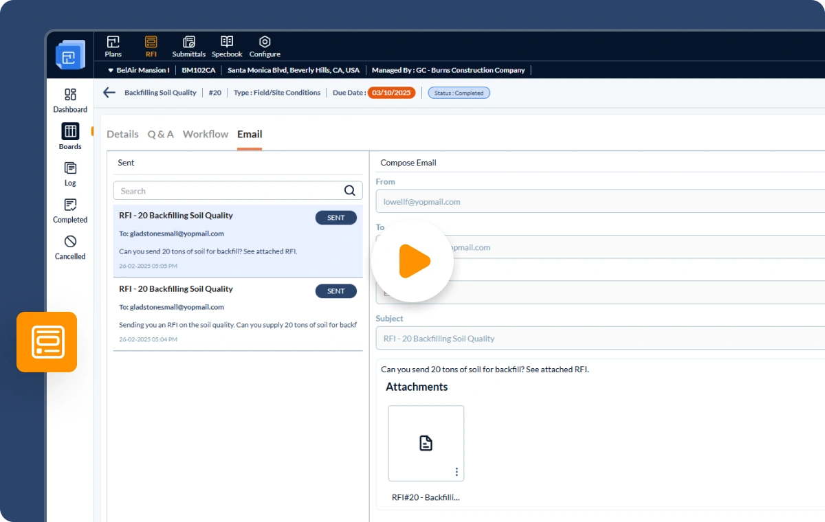 - Contextual Communication - Send and receive emails directly from RFIs, Submittals, and Change Orders to collect timely, relevant input from external parties.