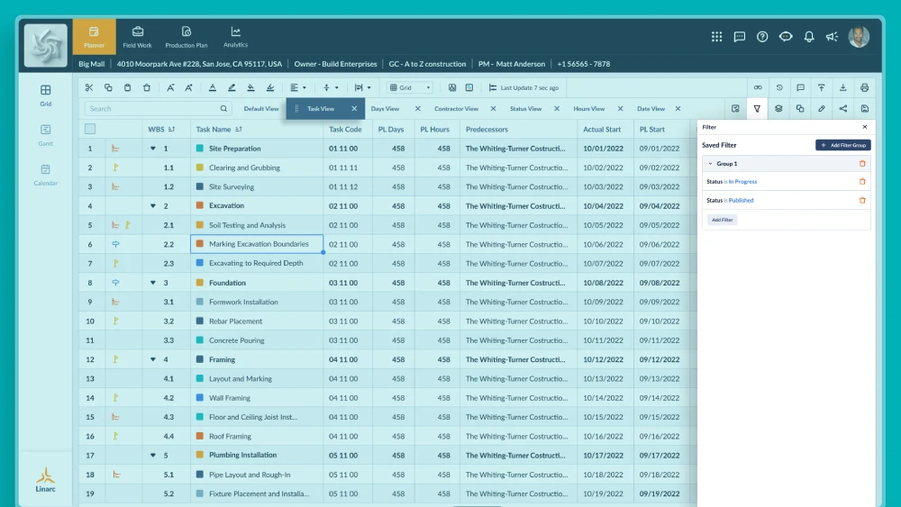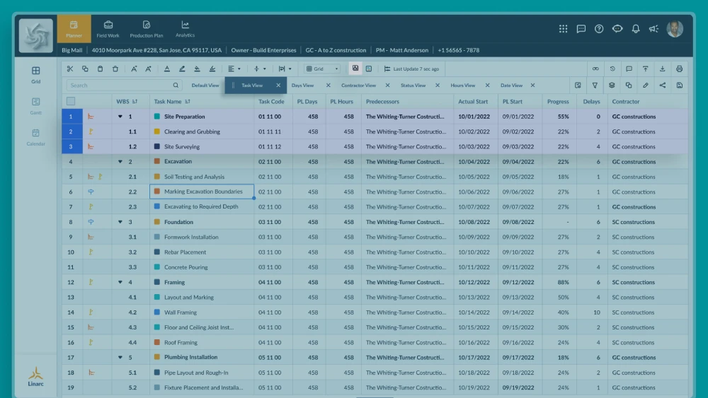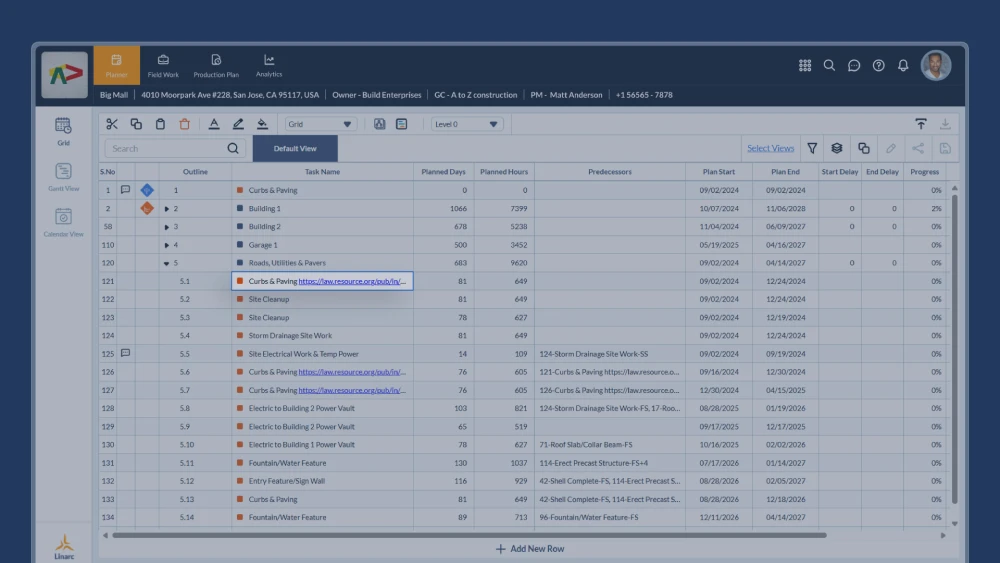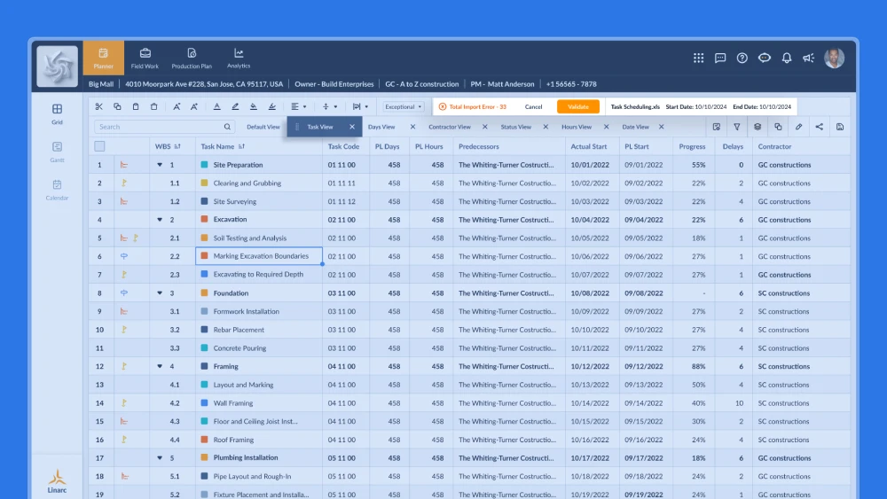 The improved schedule planner enables the seamless import of schedules from Primavera P6 or Microsoft Project, even for ongoing projects currently managed on those platforms. This functionality transfers all critical data, including task progress percentages and key data points, facilitating a smooth migration of live schedules into Linarc’s more intuitive environment. Please note that schedule imports are only available for projects without pre-existing published tasks in Linarc.
