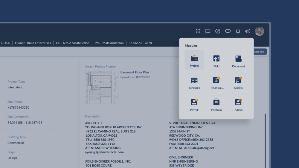 The new app launcher features intuitive category selectors, allowing users to effortlessly navigate to the management tools/modules of their choice. With well-organized categories, users can quickly find what they need, eliminating clutter and enhancing overall efficiency. Key categories include Project Admin, Document Management, Scheduler, Finance Management, and more, providing streamlined access to essential tools and functions.