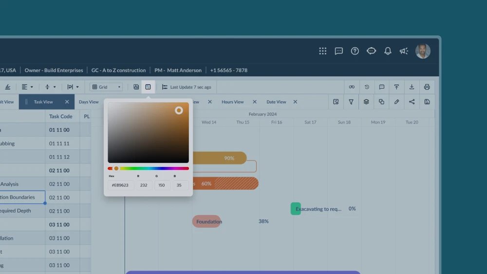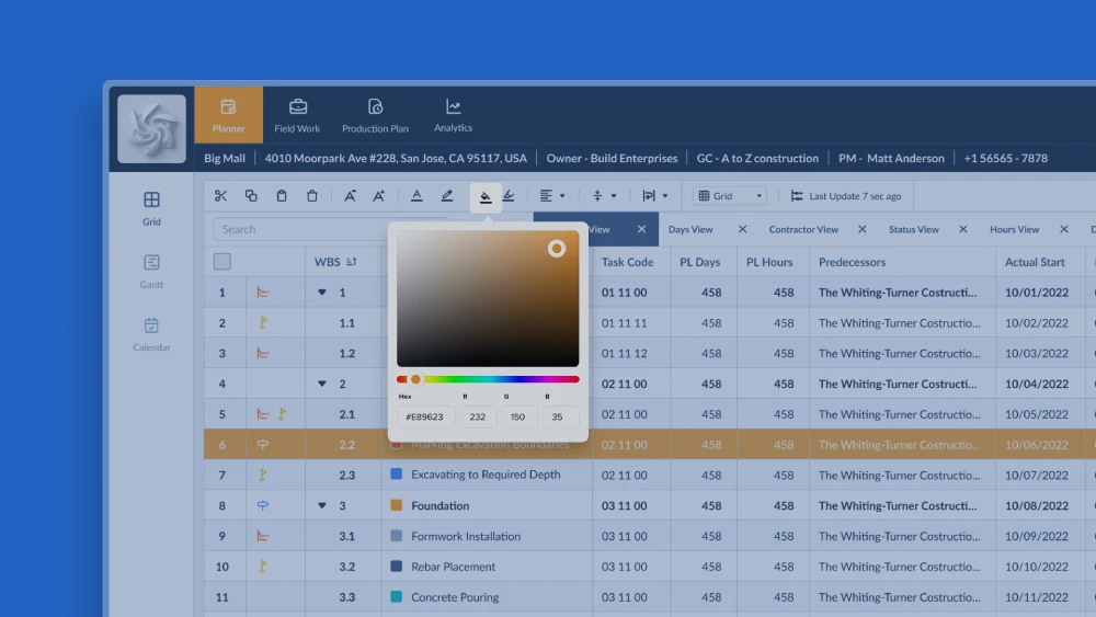 You can assign distinct colors to each line item in the schedule planner for use in their corresponding Gantt chart bars. Applying color codes to differentiate tasks based on various factors such as categories, contractors, and other criteria, enhances visibility and allows for easy distinction and management of task timelines.