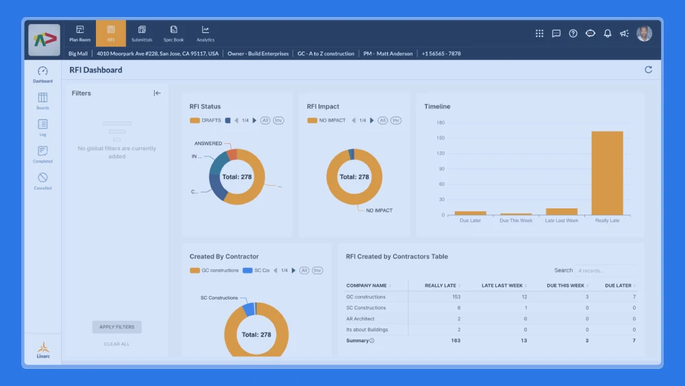 The dashboards in various modules, like the RFI, Submittals, Change Order, etc., have been improved to provide greater visibility and insights into various metrics and statistics, which are shown as graphs and charts. The cross-filtering feature enables you to choose a category on one chart and instantly apply that as a filter across all visualizations. This action refines the data displayed in the other charts, showing only the statistics related to the selected category of items. Additionally, you can layer multiple filters by selecting different sectors across the charts, allowing for deeper, more specific analysis of the filtered results.