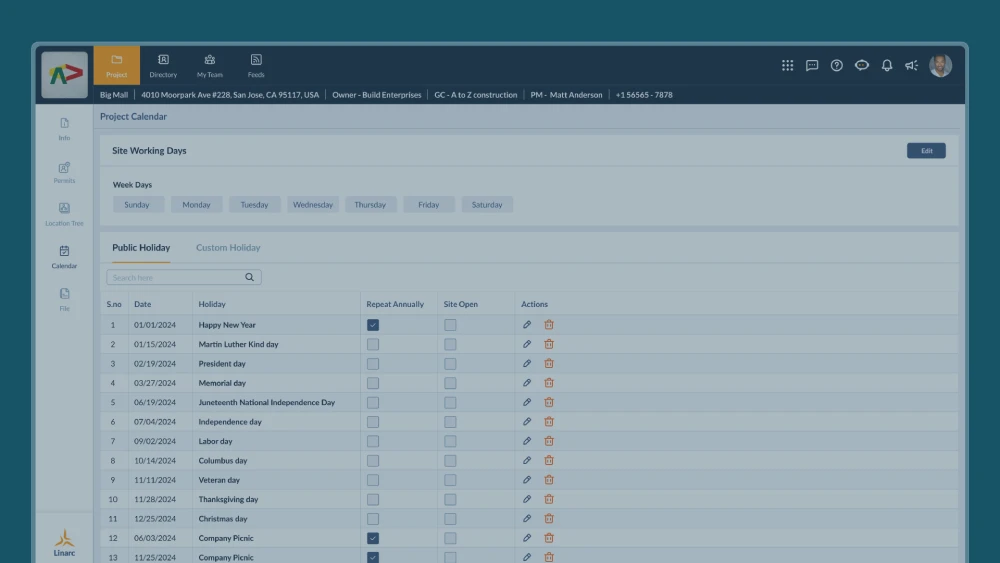 The Holiday Calendar setting in the project setup enables you to define working weekdays, weekends, and holidays when the site will be closed. These non-working days are automatically factored into the scheduling calculations, affecting timelines for tasks such as scheduled project activities, due dates for documents in approval workflows, punchlist items, and more. This ensures accurate time tracking by accounting for weekends and holidays, preventing delays, and ensuring realistic project timelines.