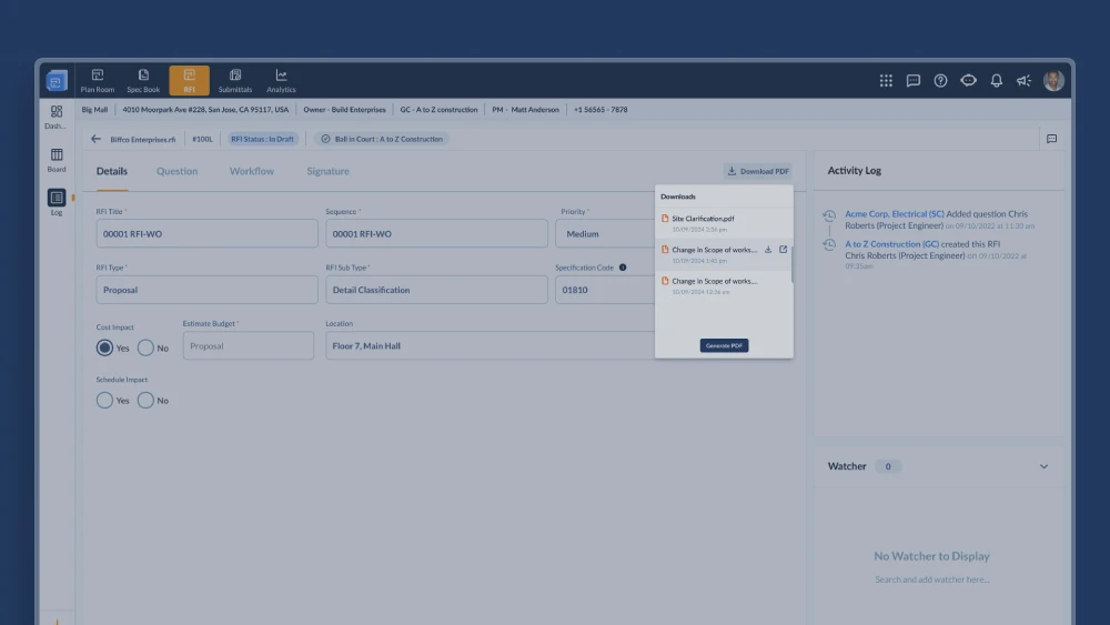Plan drawings, with or without markups, that are linked to descriptions, questions, requests, or responses in documentation items such as RFIs, Submittals, and Change Orders, are automatically added as image attachments to the corresponding items. These image attachments are also included in the PDF versions of the respective documents for comprehensive visibility.