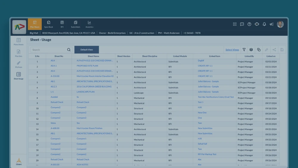 The 'Plan Sheet Usage' screen in the Plans module provides a detailed overview of plan sheets referenced in key documentation items, including RFIs, Change Orders, Submittals, and Punch Lists. This feature not only gives you a comprehensive view of which plan sheets are most frequently used across project documents but also helps track usage trends, ensuring you can identify critical sheets and streamline document management.